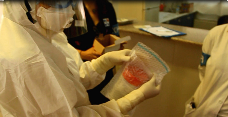 Σε κάποιες από τις φωτογραφίες φαίνεται η ομάδα υποδοχής στον χώρο καραντίνας, που αποτελείται από γιατρό νοσηλεύτρια και απολυμαντή, αλλά και η ασφαλής προετοιμασία δείγματος αίματος του «ασθενούς» σε συσκευασία τριών θηκών.