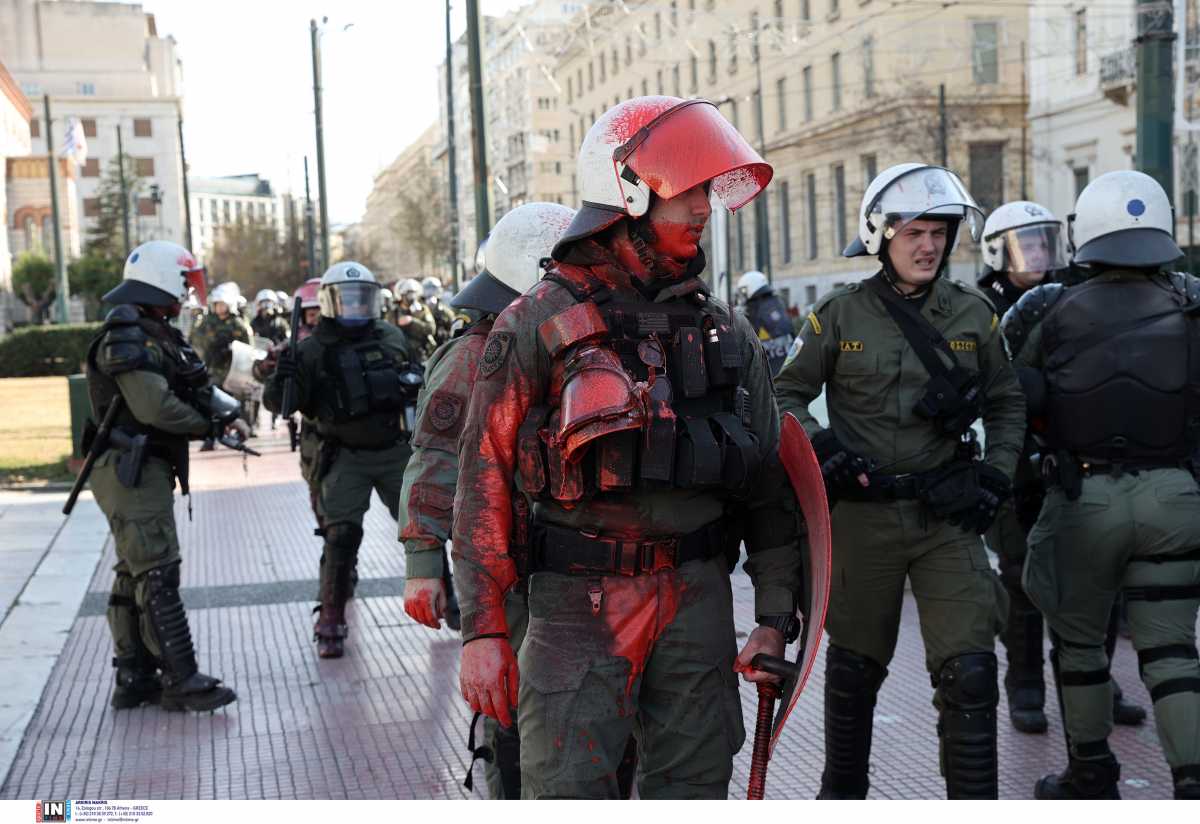 Τα επεισόδια έγιναν όταν άτομα πέταξαν στις δυνάμεις των ΜΑΤ κόκκινες μπογιές, με την ένταση στα Προπύλαια, πάντως, να κρατά λίγη ώρα.