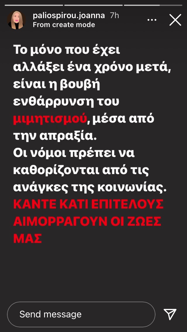 «Το μόνο που έχει αλλάξει ένα χρόνο μετά, είναι η βουβή ενθάρρυνση του μιμητισμού, μέσα από την απραξία. Οι νόμοι πρέπει να καθορίζονται από τις ανάγκες της κοινωνίας. ΚΑΝΤΕ ΚΑΤΙ ΕΠΙΤΕΛΟΥΣ ΑΙΜΟΡΡΑΓΟΥΝ ΟΙ ΖΩΕΣ ΜΑΣ», καταλήγει το Instagram Story της 32χρονης Ιωάννας Παλιοσπύρου.