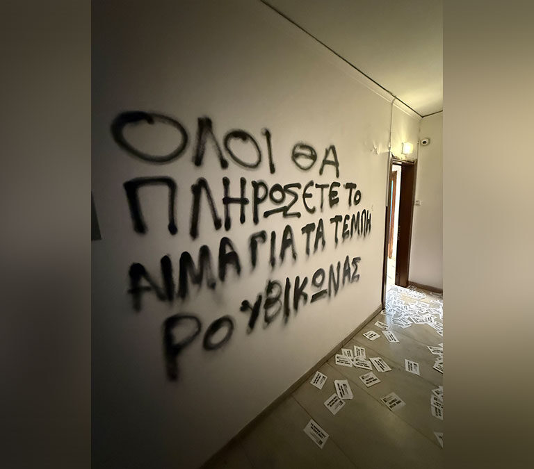 Μέλη του «Ρουβίκωνα» έκαναν επίθεση στο πολιτικό γραφείο του βουλευτή Α’ Θεσσαλονίκης της Νέας Δημοκρατίας Στράτου Σιμόπουλου κι έγραψαν συνθήματα στον τοίχο, ενώ πέταξαν τρικάκια για το σιδηροδρομικό δυστύχημα των Τεμπών με την υπογραφή του.