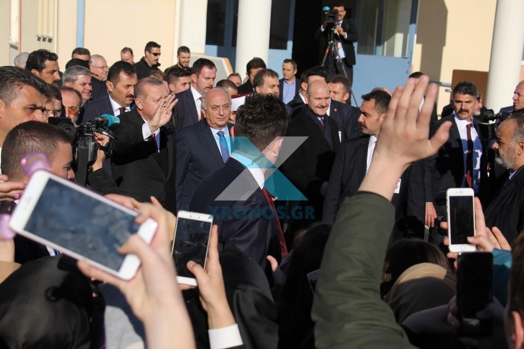 Στο σχολείο ο κ. Ερντογάν συνομίλησε με μαθητές και καθηγητές στην αυλή, όπου, εκτός από μαθητές είχαν συγκεντρωθεί και μέλη της μουσουλμανικής κοινότητας, όπως και έξω από αυτό.