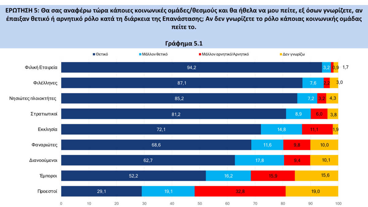 Ανάμεσα στις κοινωνικές ομάδες, τις οργανώσεις και τους θεσμούς που συνέβαλαν στην Επανάσταση, αναγνωρίζεται σχεδόν ομόφωνα ο ρόλος της Φιλικής Εταιρείας (94,2%), των Φιλελλήνων (87,1%) και των νησιωτών πλοιοκτητών (85,2%), των στρατιωτικών (κλέφτες και αρματωλοί 81,2%), της Εκκλησίας (72,1%) και των Φαναριωτών (68,6%).