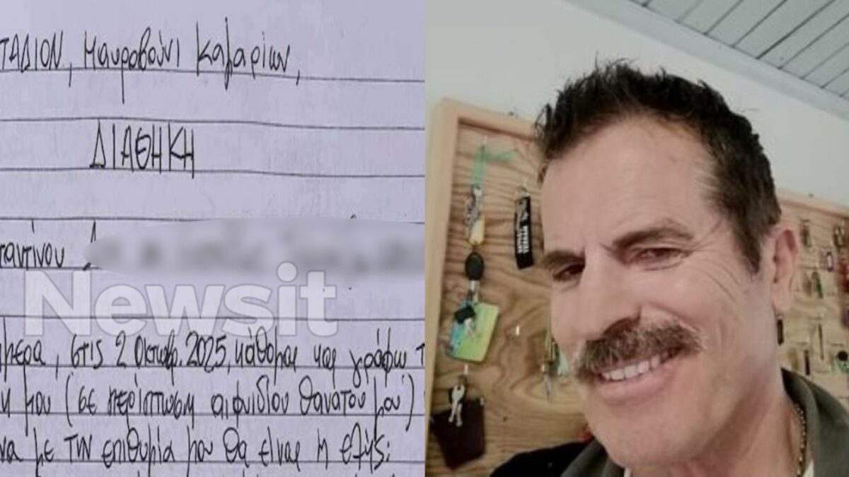 «Σήμερα, στις 2 Οκτωβρίου 2025, κάθομαι και γράφω την διαθήκη μου (σε περίπτωση αιφνιδίου θανάτου μου) και σύμφωνα με την επιθυμία μου, θα είναι η εξής», αναφέρει στις πρώτες σειρές της διαθήκης του ο 68χρονος και στη συνέχεια ορίζει τους κληρονόμους του.