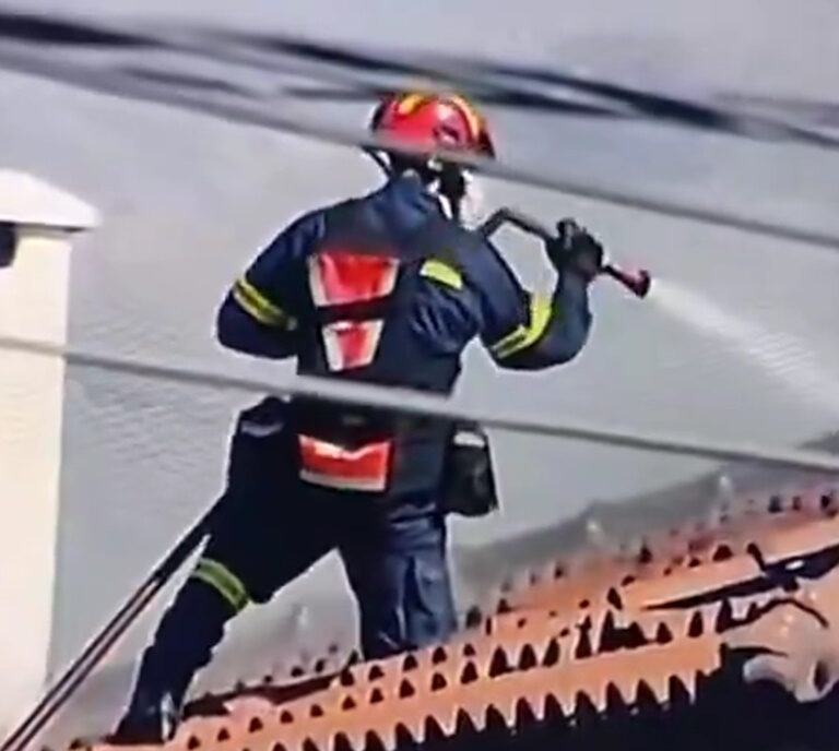 Στο βίντεο – που δημοσιεύτηκε στο Forecast Weather – φαίνεται ο πυροσβέστης να σκαρφαλώνει στη σκεπή ενός σπιτιού με δυσκολία, κουβαλώντας παράλληλα τη πυροσβεστική μάνικα.