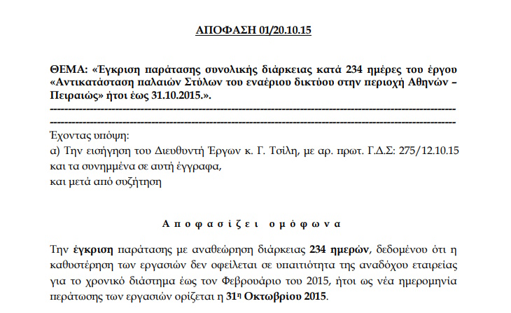 Το έργο της αντικατάστασης των στύλων δε… θέλει όμως να ολοκληρωθεί. Όπως προκύπτει από τις αποφάσεις της ΟΣΥ, μέχρι τον Φεβρουάριο του 2015 υπάρχουν καθυστερήσεις στην ολοκλήρωση του έργου και η εταιρεία δίνει παράταση στην ημερομηνία ολοκλήρωσής του, μέχρι την 31η Οκτωβρίου 2015.