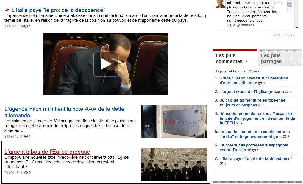 Τέλος, το άρθρο της έντυπης έκδοσης της γαλλικής εφημερίδας, το οποίο αναρτήθηκε και στην ηλεκτρονική της σελίδα, σχολιάζει επικριτικά την στάση της Ιεράς Συνόδου απένταντι στα μέτρα σταθερότητας που επέβαλε η τρόικα στην Ελλάδα.