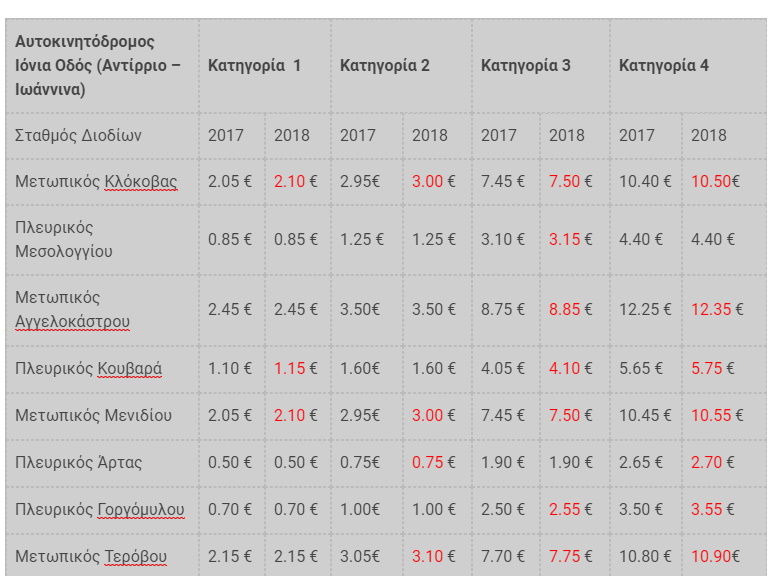 Με κόκκινο χρώμα παρουσιάζονται οι τιμές που έχουν αυξήσεις από 0.05€ έως 0.10€ και με μαύρο χρώμα οι τιμές που παραμένουν αμετάβλητες σε σύγκριση με το 2017.