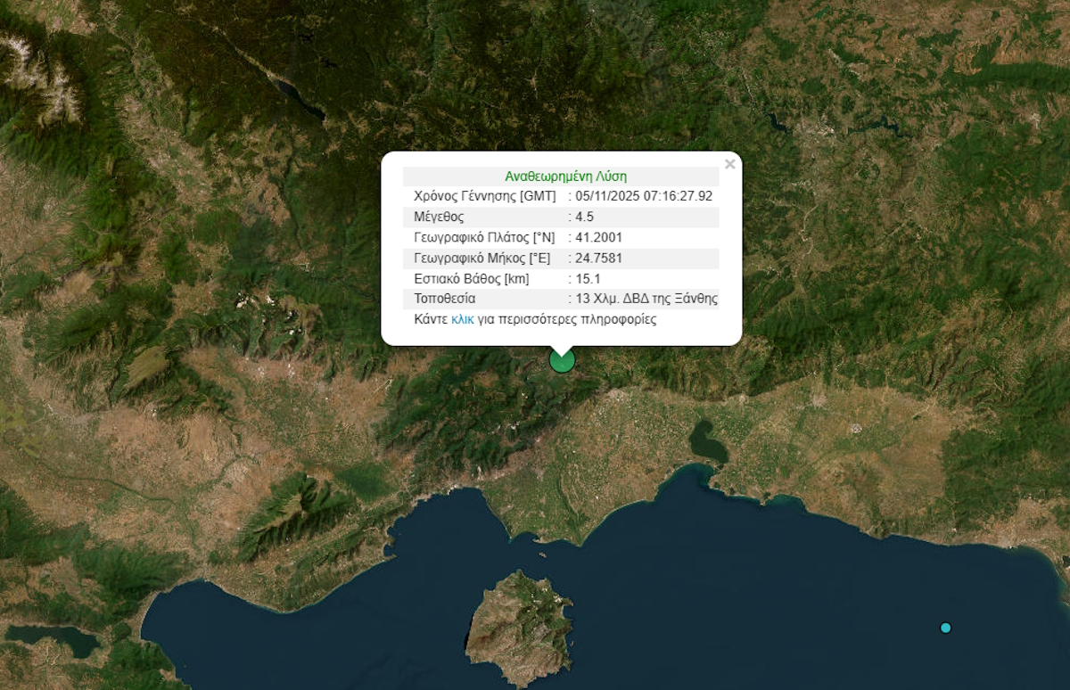 Δυνατός σεισμός 4,5 Ρίχτερ σημειώθηκε το πρωί της Τετάρτης (5.11.2025) κοντά στην Ξάνθη