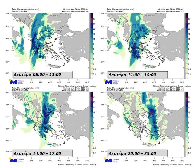 Τα φαινόμενα όμως θα έχουν σύντομο χαρακτήρα, αφού σταδιακά και από τα δυτικά γρήγορα οι βροχές θα εξασθενήσουν. Η κίνηση του ψυχρού μετώπου και τα εκτιμώμενα ύψη βροχόπτωσης που αυτό θα προκαλέσει κατά τη διάρκεια της Δευτέρας 04/01, παρουσιάζεται στην παρακάτω ομάδα χαρτών βροχής.