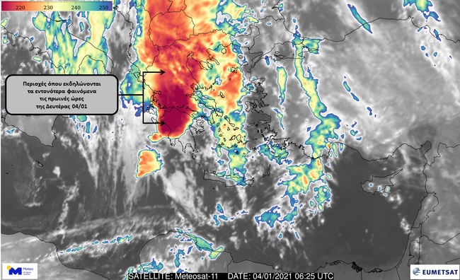 Ήδη, δίνει σημαντικά ύψη βροχής στα δυτικά τμήματα της χώρας μας. Ενδεικτικά, αναφέρεται ότι από τα μεσάνυχτα έως τις 09:00 το πρωί της Δευτέρας 04/01, ο μετεωρολογικός σταθμός του ΕΑΑ στα Θεοδώριανα Άρτας, κατέγραψε 61 mm.