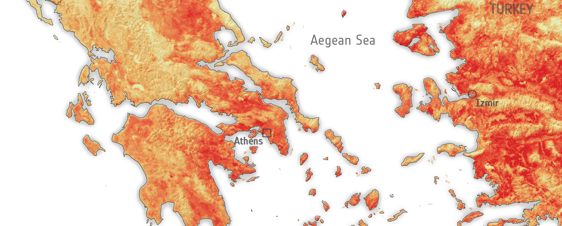 Εντυπωσιακές είναι οι εικόνες του δορυφορικού χάρτη της Ευρωπαϊκής Διαστημικής Υπηρεσίας (ESA), που δείχνει τη θερμοκρασία της επιφάνειας της γης στην Ελλάδα και των γύρω χωρών, στις 30 Ιουνίου.