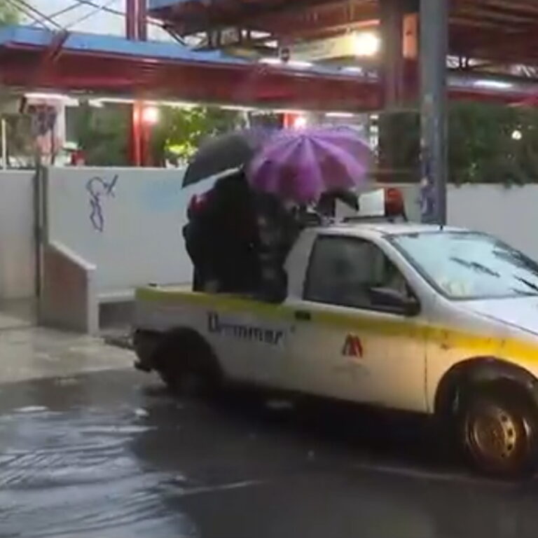 Το φορτηγάκι του δήμου Μοσχάτου πάρκαρε έξω από τον σταθμό του ηλεκτρικού και αρκετοί πολίτες ανέβηκαν στην καρότσα του προκειμένου να περάσουν χωρίς να κινδυνεύσουν από την «λίμνη» που είχε δημιουργηθεί.