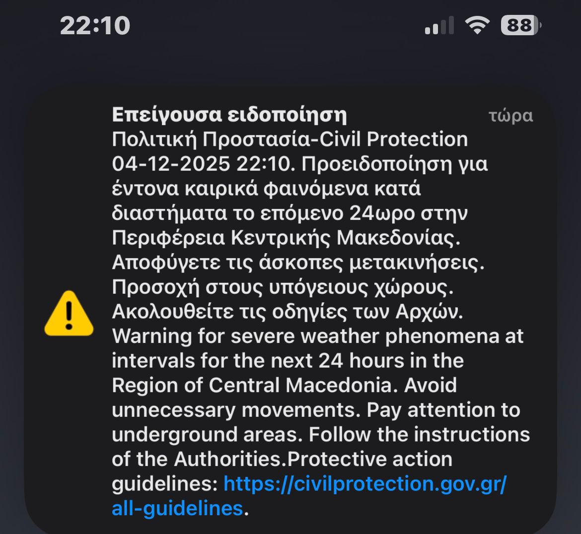 «Προειδοποίηση για έντονα καιρικά φαινόμενα κατά διαστήματα μέχρι αύριο το μεσημέρι στην Περιφέρεια Αττικής. Αποφύγετε τις άσκοπες μετακινήσεις. Προσοχή στους υπόγειους χώρους. Ακολουθείτε τις οδηγίες των Αρχών».