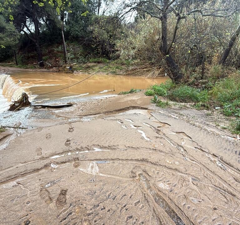 Στο Πικέρμι στην οδό Ήμερου Πεύκου έσπασε το ρέμα από τα ορμητικά νερά, υπερχείλησε ο δρόμος που παραμένει κλειστός.