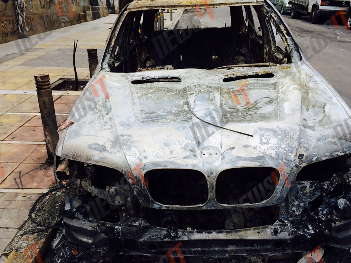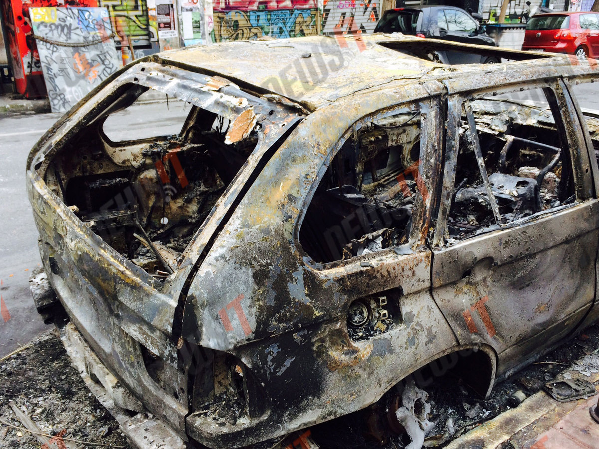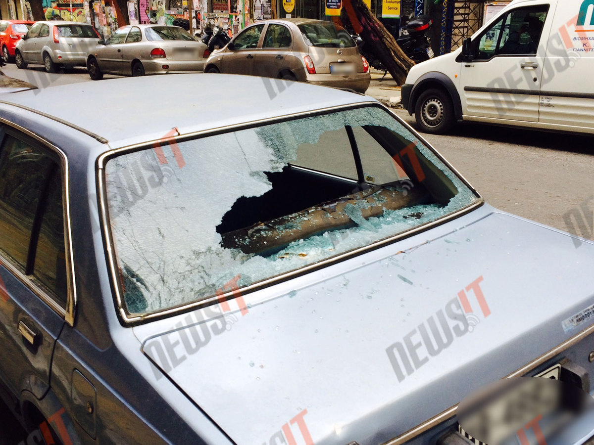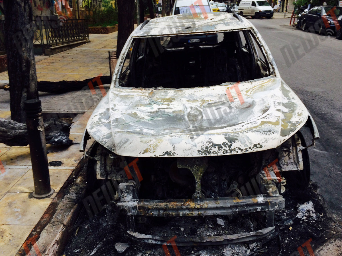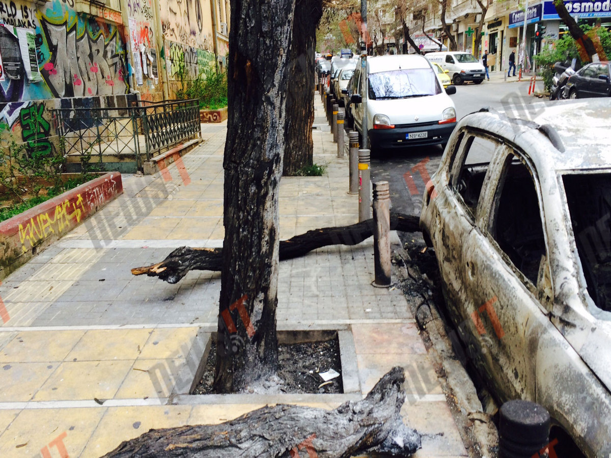 Δυο αυτοκίνητα κάηκαν ολοσχερώς από μολότοφ. Σε άλλα, οι κουκουλοφόροι έσπασαν τζάμια και παρμπρίζ, άλλα έχουν καεί μερικώς από φωτοβολίδες και μολότοφ των αναρχικών.