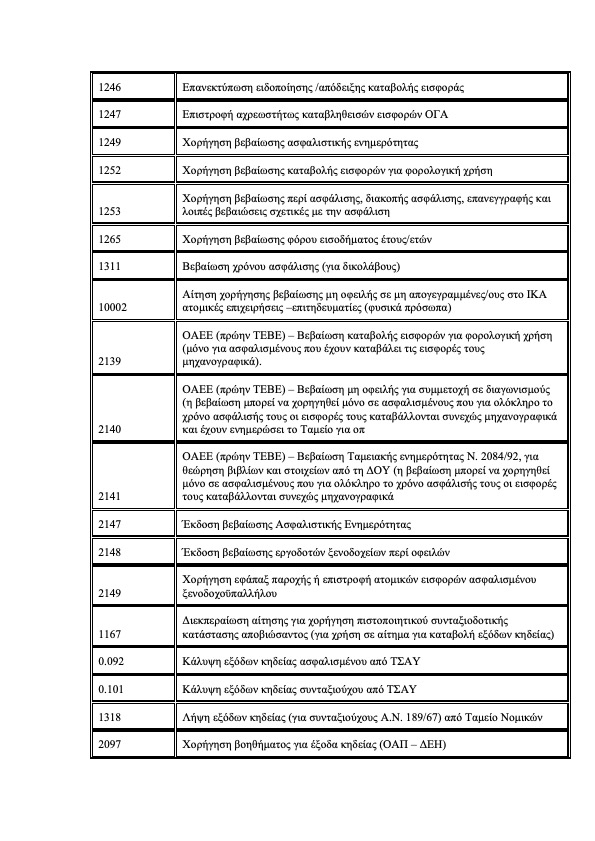 Μερικές από τις 68 διαδικασίες του e-ΕΦΚΑ που καταργούνται από τα ΚΕΠ είναι η ανανέωση βιβλιαρίου ασθένειας ΙΚΑ (άμεσα ασφαλισμένου), έκδοση βιβλιαρίων νοσηλείας ασφ. Δημοσίου/ Εν ενεργεία υπαλλήλου, αντικατάσταση απολεσθέντος βιβλιαρίου κλάδων σύνταξης και πρόνοιας, έκδοση βεβαίωσης ασφαλιστικής ενημερότητας κ.α.