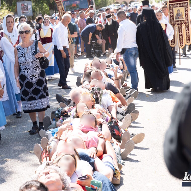 Τότε, δεκάδες πιστοί ξάπλωσαν στο έδαφος, για να περάσει από πάνω τους του σκήνωμα του Αγίου, όπως βλέπετε στις εικόνες του kefalonitis.com.
