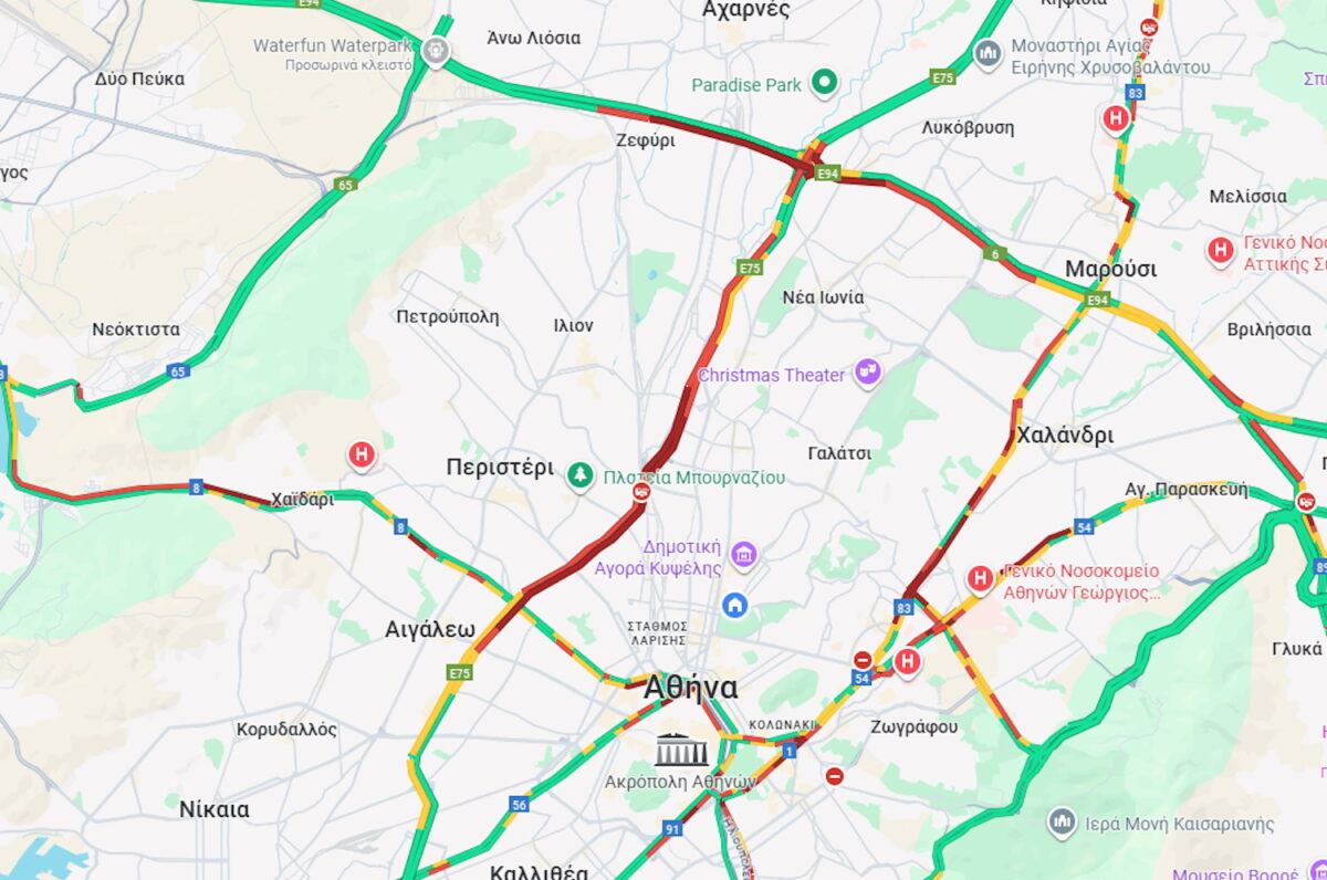 Το μποτιλιάρισμα στον Κηφισό ξεκίνησε κατά τις 6.30 το πρωί της Πέμπτης (23.10.2025) στο ρεύμα ανόδου πριν από το ύψος της Λένορμαν και φτάνει μέχρι τη Νέα Φιλαδέλφεια. Μετά την 7 άρχισε να αυξάνεται η κίνηση και στο ρεύμα καθόδου.