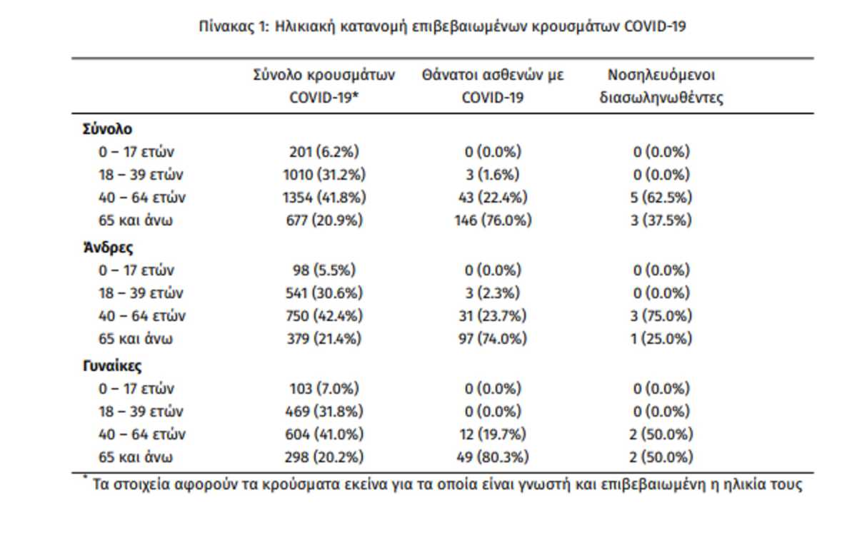 Η μέση ηλικία των κρουσμάτων είναι 47 έτη (εύρος 0 έως 102 ετών), ενώ η μέση ηλικία των θανάτων είναι 76 έτη (εύρος 35 έως 102 ετών). Η ηλικιακή κατανομή των (α) συνολικών κρουσμάτων, (β) των περιστατικών που κατέληξαν σε θάνατο και (γ) των ασθενών που νοσηλεύονται διασωληνωμένοι, είναι η ακόλουθη: