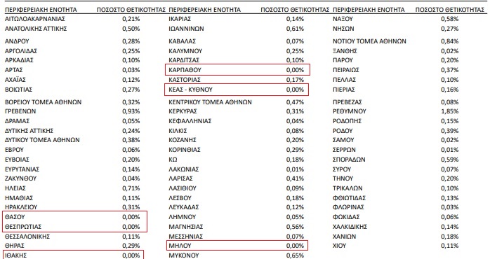 Ειδικότερα, στον πίνακα της επιδημιολογικής έκθεσης για την πορεία του κορονοϊού το ποσοστό θετικότητας στο σύνολο των ελέγχων ανά Περιφερειακή Ενότητα με δεδομένα από 28 Ιουνίου 2021 έως 04 Ιουλίου 2021 (2021-W26) διαμορφώθηκε στο 0,00% για τη Θάσο, τη Θεσπρωτία, την Ιθάκη, την Κάρπαθο, την Κέα, την Κύθνο και τη Μήλο.