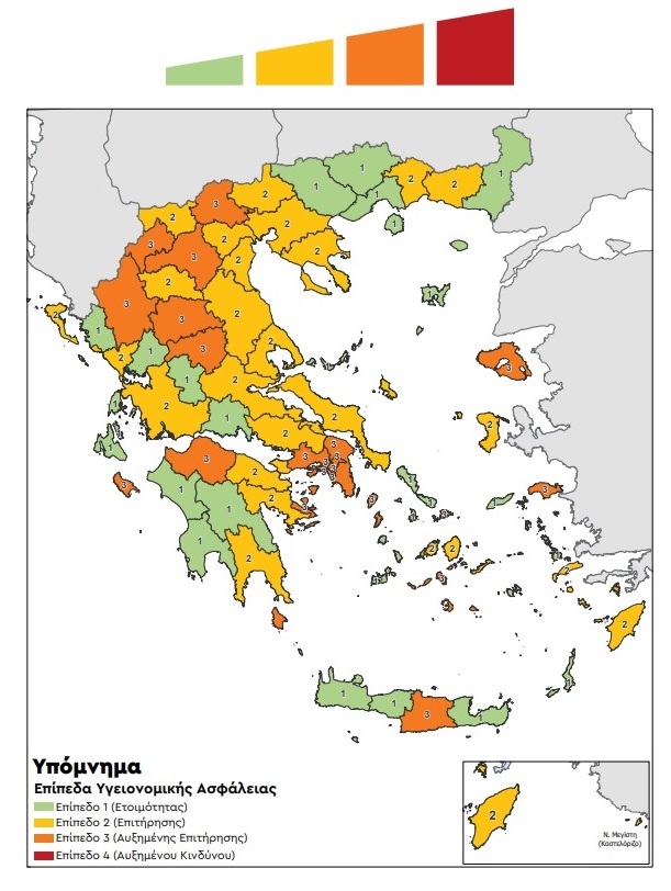 Σύμφωνα με τον Χάρτη Υγειονομικής Ασφάλειας 23 από τις 74 περιοχές της χώρας είναι σε «πορτοκαλί» συναγερμό δηλαδή σε επίπεδο αυξημένης επαγρύπνησης και η κυβέρνηση θέτει σε εφαρμογή τροποποιήσεις μέτρων και κανόνων.