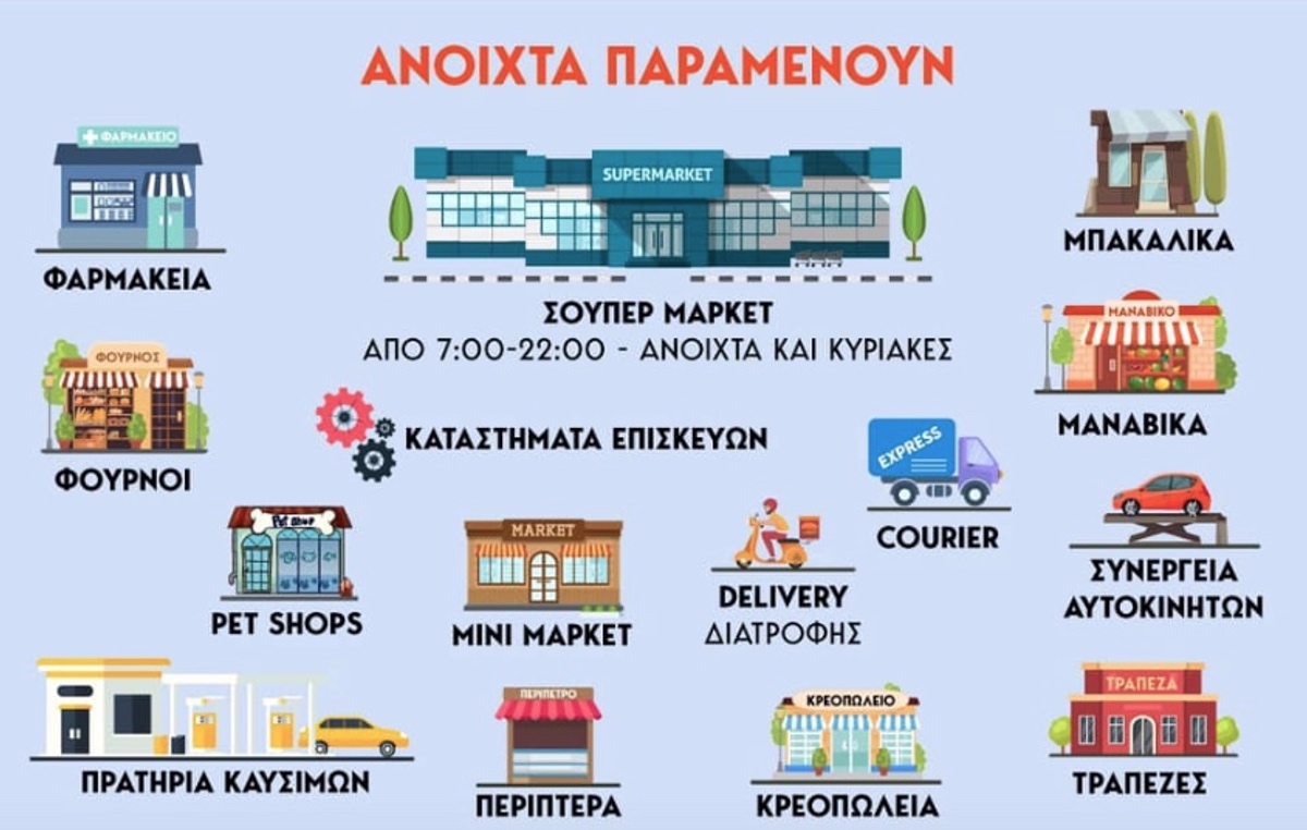 Την λίστα με τις ιδιωτικές επιχειρήσεις ανάρτησε ο Υφυπουργός Πολιτικής Προστασίας Νίκος Χαρδαλιάς. Εξαιρούνται σούπερ μάρκετ, φούρνοι, πρατήρια βενζίνης, φαρμακεία, κρεοπωλεία, τράπεζες, παντοπωλεία, περίπτερα, pet shops.