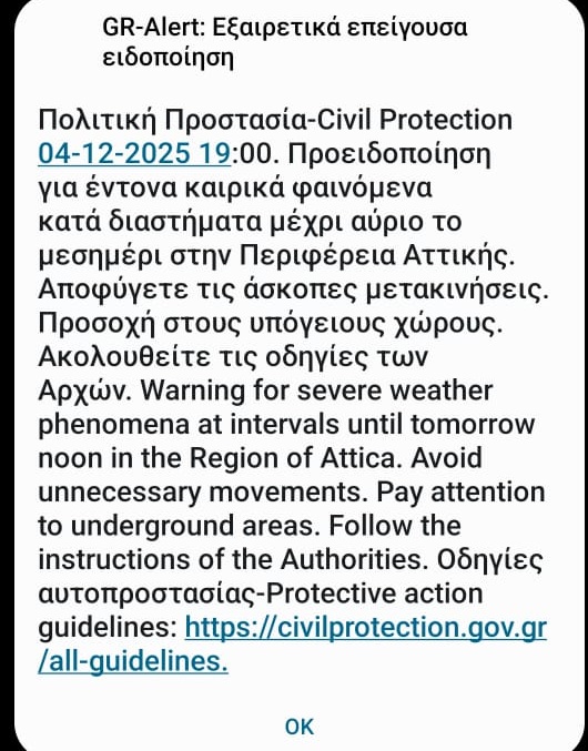 «Προειδοποίηση για έντονα καιρικά φαινόμενα κατά διαστήματα μέχρι αύριο το μεσημέρι στην Περιφέρεια Αττικής. Αποφύγετε τις άσκοπες μετακινήσεις. Προσοχή στους υπόγειους χώρους. Ακολουθείτε τις οδηγίες των Αρχών».