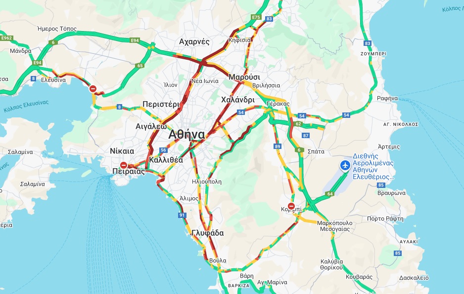 Στο κόκκινο βρίσκεται ο Κηφισός και οι κεντρικές οδικές αρτηρίες στην Αττική λόγω της κακοκαιρίας ενώ μεγάλα προβλήματα έχει και η Αττική Οδός. Δείτε χάρτη με την κίνηση