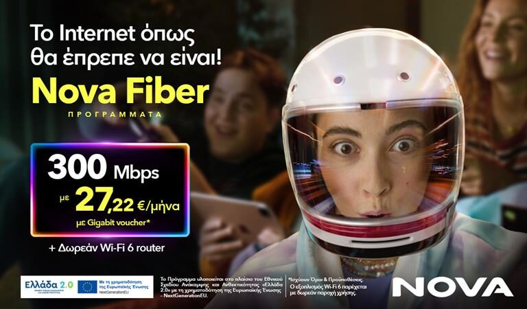 Απόκτησε σήμερα κιόλας το Nova Fiber 300 με μόνο 27,22€ τον μήνα, με Gigabit voucher και δωρεάν χρήση του WiFi 6 router. Συνδύασε οποιοδήποτε από τα Nova Fiber προγράμματα με τα προγράμματα ΕΟΝ, για να μπορείς και εσύ να ζήσεις μοναδικές αθλητικές διοργανώσεις, να παρακολουθήσεις τις πιο συναρπαστικές ταινίες και να αποκτήσεις πρόσβαση σε μία μεγάλη ποικιλία περιεχομένου, για όλη την οικογένεια.