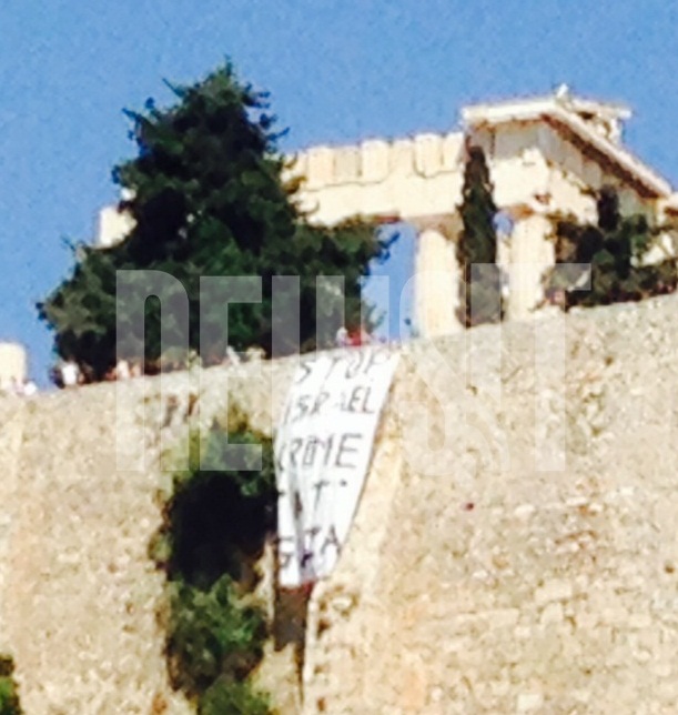 Αυτά όμως ήταν αρκετά για να περάσουν τα μέλη της αυτόνομης πρωτοβουλίας αλληλέγγυων στον παλαιστινιακό λαό το ηχηρό μήνυμά τους. Το πανό που ύψωσαν έγραφε “stop Israel crime at Gaza”.