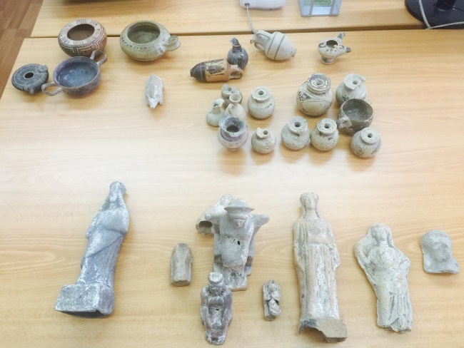 Στα χέρια των παρανόμων βρέθηκαν: 14 μικρογραφίες αγγείων γεωμετρικών και αρχαϊκών χρόνων, 2 αγγεία γεωμετρικών χρόνων που φέρουν γραπτή διακόσμηση, 2 αγγεία εκ των οποίων το ένα είναι ληκύθιο και το άλλο αποτελεί μικρογραφία αγγείου της υστεροκλασικής περιόδου,1 λυχνάρι πρώιμων βυζαντινών χρόνων και ένα αγγείο πρώιμων βυζαντινών χρόνων, 1 μικρό πήλινο ειδώλιο χοίρου γεωμετρικής περιόδου, 8 πήλινα ειδώλια καθιστών και όρθιων γυναικείων μορφών,1 πήλινο ειδώλιο όρθιας γυναικείας μορφής.