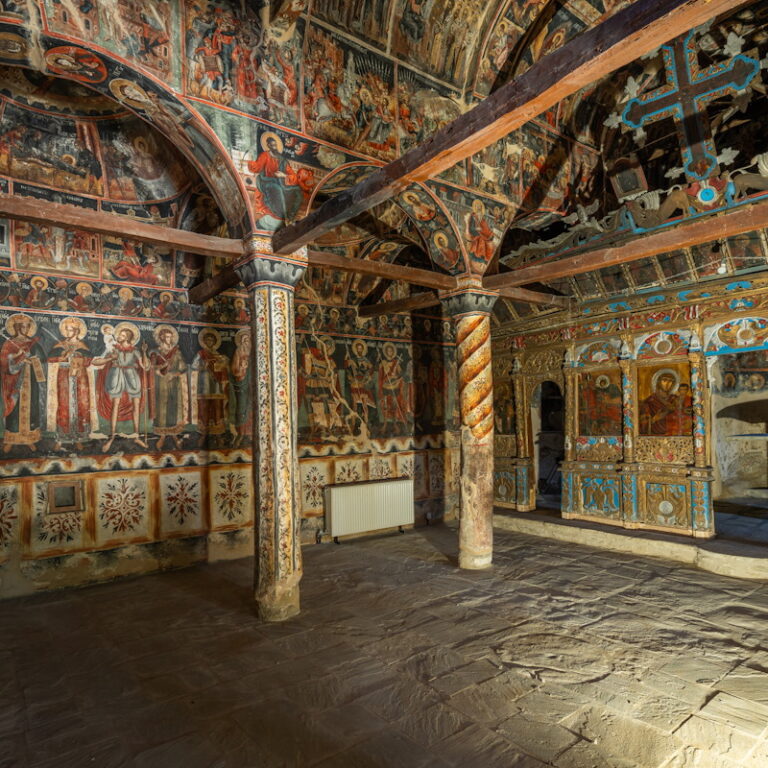 Η Εφορεία Αρχαιοτήτων Τρικάλων υλοποίησε τη στερέωση και συντήρηση του τοιχογραφικού διακόσμου, βάσει της εγκεκριμένης μελέτης συντήρησης. Οι εργασίες συμπεριέλαβαν και τις ζωγραφικές των κιόνων και των ξύλινων ελκυστήρων. Προηγήθηκε προστασία των ευπαθών τμημάτων με υφασμάτινους οπλισμούς και στη συνέχεια η στερέωσή τους. Απομακρύνθηκαν μεταγενέστερα επιχρίσματα, κονιάματα και επιχρωματισμοί και αποκαταστάθηκαν τα σαθρά υποστρώματα. Στερεώθηκε και καθαρίστηκε η ζωγραφική επιφάνεια, συμπληρώθηκαν κενές περιοχές και ρωγμές και επιπλέον έγιναν περιμετρικές συγκρατήσεις. Πραγματοποιήθηκε τέλος αισθητική αποκατάσταση όπου ήταν απαραίτητο.