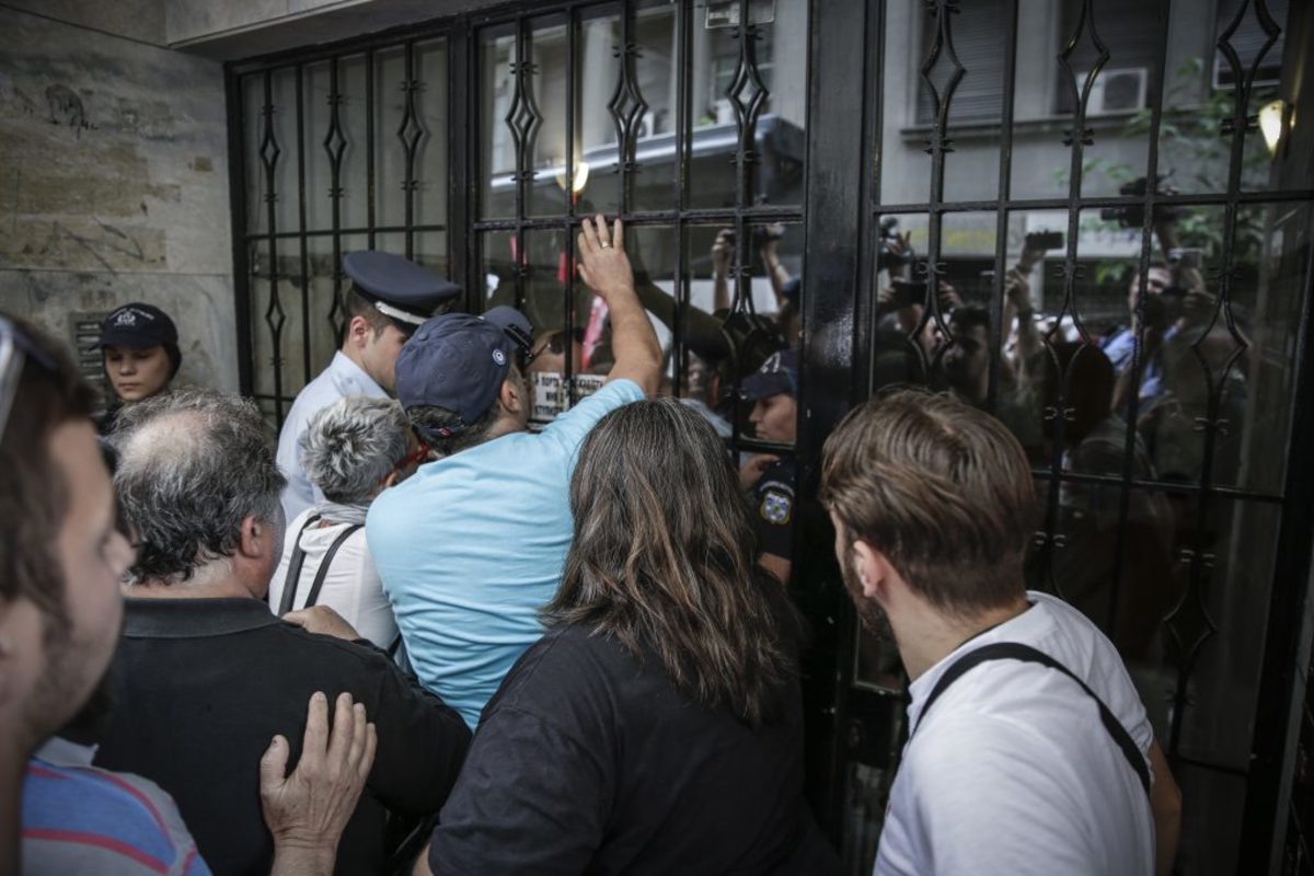 Τα πνεύματα οξύνθηκαν όταν οι διαδηλωτές επιχείρησαν να σπάσουν την πόρτα και να μπουν μέσα στο κτίριο όπου στεγάζεται το συμβολαιογραφικό γραφείο. Τότε δυνάμεις των ΜΑΤ μπήκαν μπροστά… δημιουργώντας μία ασπίδα ώστε να σταματήσουν τους διαμαρτυρόμενους.