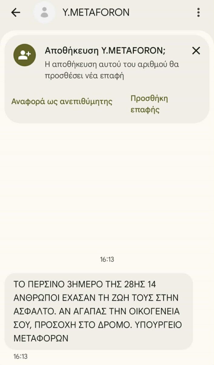 Μάλιστα, στο μήνυμα που «χτύπησε» στα κινητά το απόγευμα της Παρασκευής (24.10.2025), το υπουργείο Υποδομών και Μεταφορών υπενθυμίζει ότι πέρυσι, την ίδια περίοδο, 14 άνθρωποι έχασαν τη ζωή τους στην άσφαλτο.