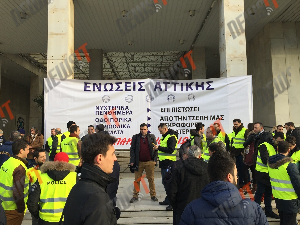 Παράσταση διαμαρτυρίας πραγματοποιούν οι αστυνομικοί στην είσοδο της ΓΑΔΑ.