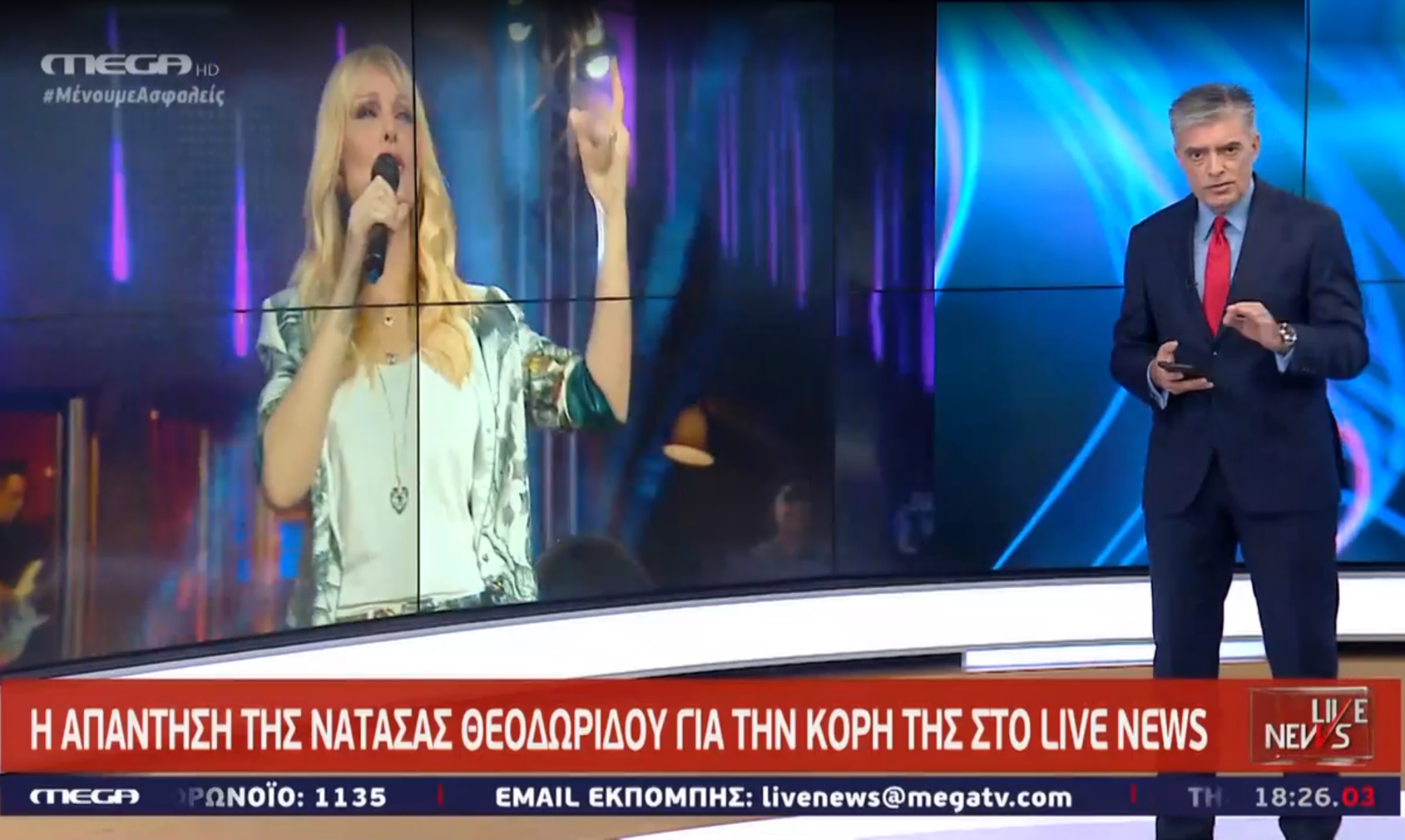 Η αγαπημένη τραγουδίστρια Νατάσα Θεοδωρίδου μίλησε αποκλειστικά στο LiveNews του Mega και το Νίκο Ευαγγελάτο αναφορικά με την εμπλοκή του ονόματος της κόρης της σε πάρτι αλλά και σε ενδεχόμενη διασπορά κορονοϊού.
