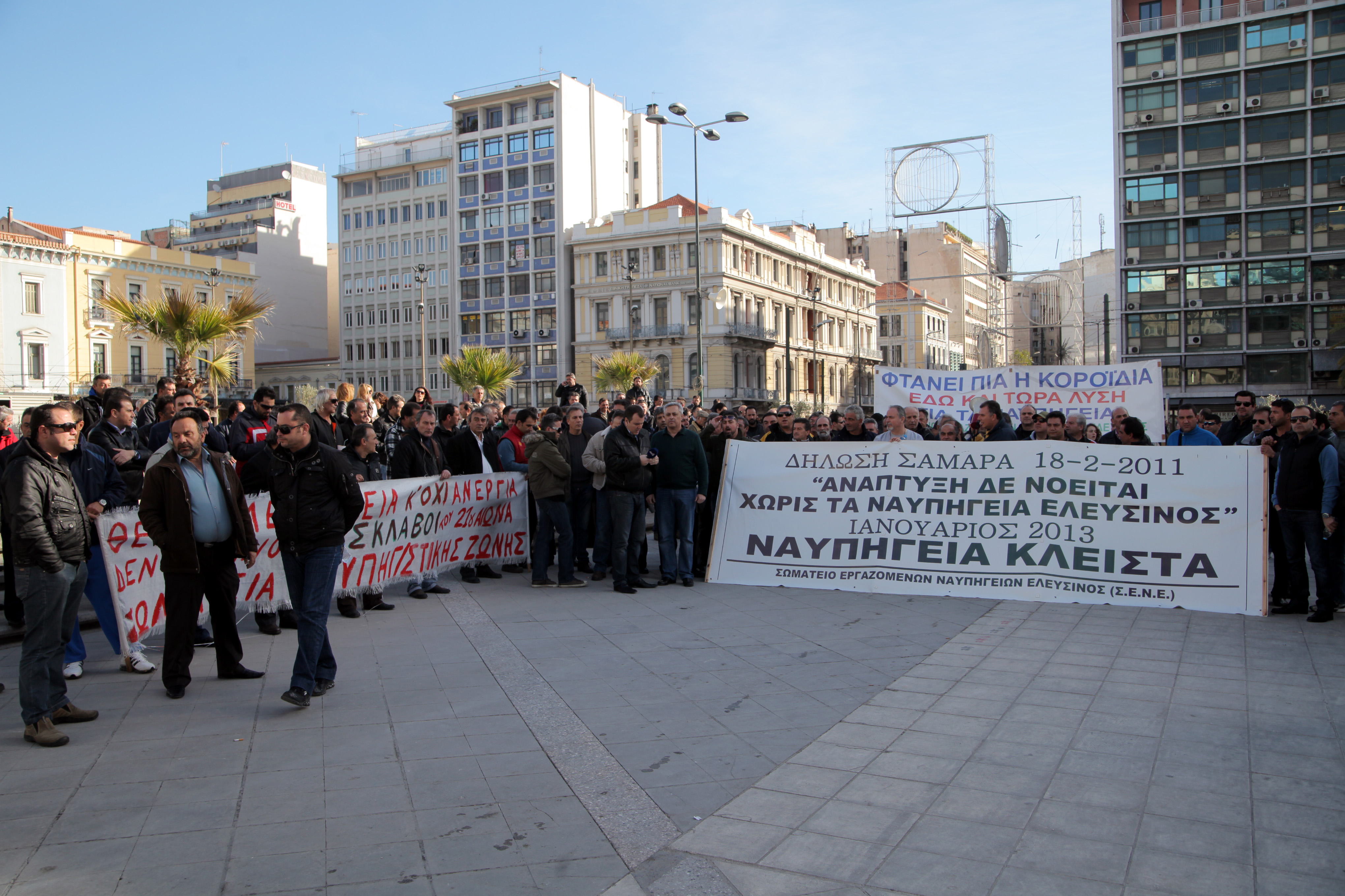 Την Παρασκευή, οι εργαζόμενοι στα Ναυπηγεία Ελευσίνας είχαν πραγματοποιήσει συγκέντρωση διαμαρτυρίας στο Πεντάγωνο, ζητώντας να δοθεί άμεσα λύση στο πρόβλημα με τα δεδουλευμένα τους.
