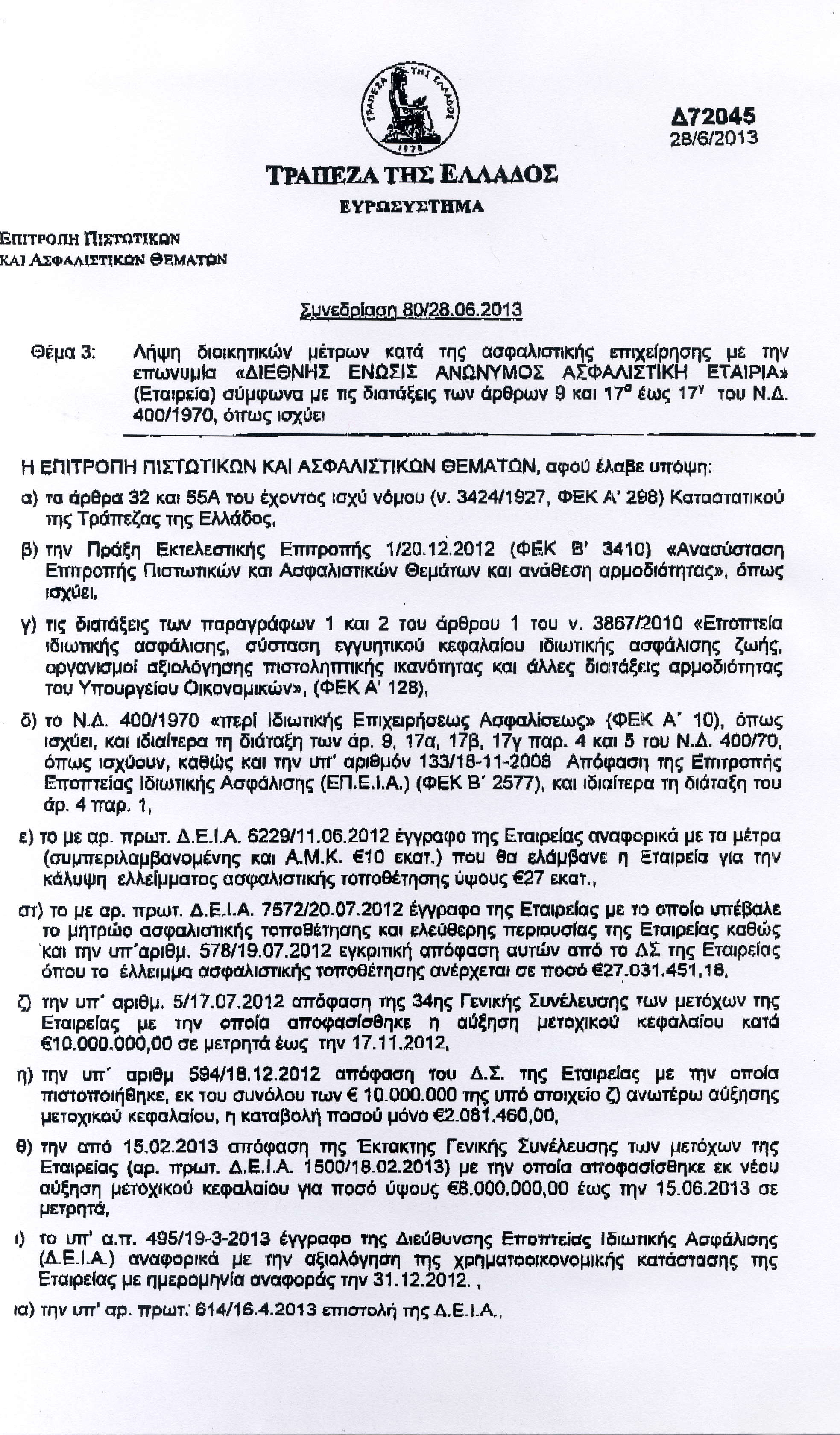 Με απόφασή της η Τράπεζα της Ελλάδος, αναστέλλει την λειτουργία της εταιρείας "Διεθνής Ένωσις".