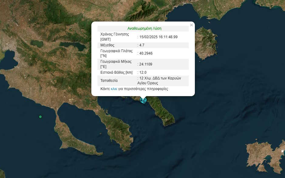 «Κουνιέται» το Άγιο Όρος. Νέος ισχυρός σεισμός μεγέθους 4,7 βαθμών της κλίμακας Ρίχτερ – 4,8 σύμφωνα με την Αυτόματη Λύση του Γεωδυναμικού Ινστιτούτου του Εθνικού Αστεροσκοπείου Αθηνών – μετά τη διπλή δόνηση 3,2 και 3,5 βαθμών νωρίτερα το απόγευμα του Σαββάτου (15.02.2025).