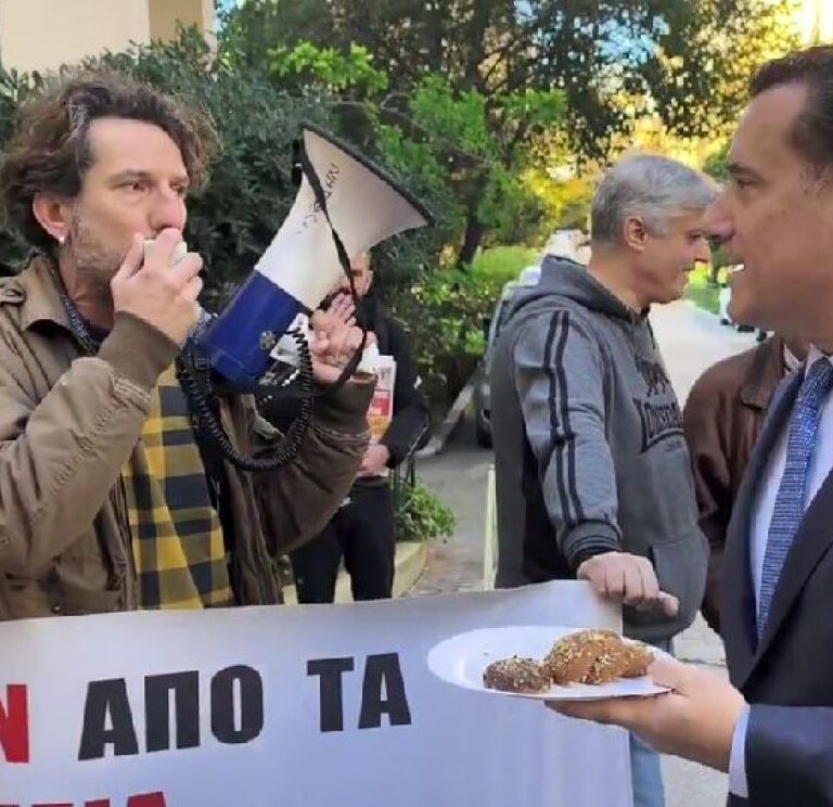 Ο Άδωνις Γεωργιάδης πρόσφερε μελομακάρονα σε εργαζόμενους στο νοσοκομείο «Έλενα Βενιζέλου» που διαμαρτύρονταν