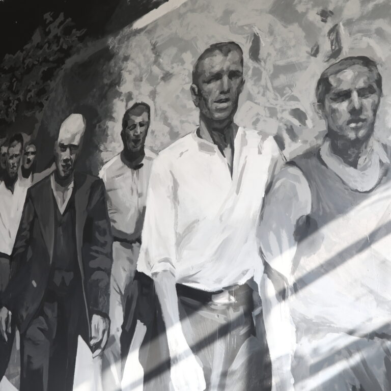 Η τοιχογραφία αναπαριστά μία από τις πλέον εμβληματικές εικόνες της υπόθεσης που έχει συγκλονίσει το τελευταίο διάστημα την ελληνική κοινωνία: φωτογραφικό τεκμήριο με μελλοθάνατους αγωνιστές, λίγες στιγμές πριν από την εκτέλεσή τους από τις κατοχικές δυνάμεις, την Πρωτομαγιά του 1944 στην Καισαριανή.