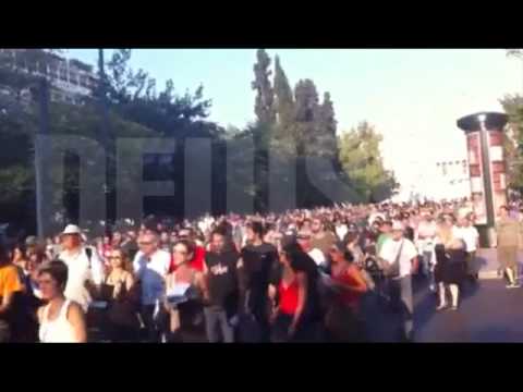Οι Αγανακτισμένοι περίπου 500 άτομα ξεκίνησαν από το Σύνταγμα και με συνθήματα κατευθύνθηκαν προς το δημαρχείο της Αθήνας, προκειμένου να διαμαρτυρηθούν για το ξήλωμα των σκηνών τους, τις προηγούμενες ημέρες.