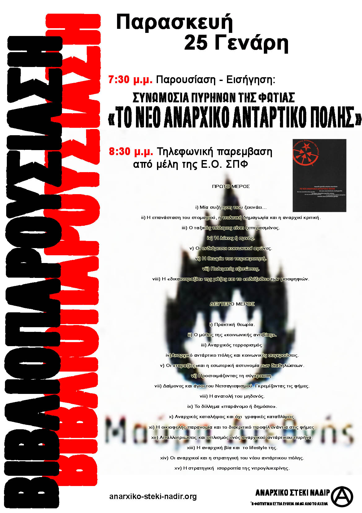 Η παρουσίαση του βιβλίου των Πυρήνων της Φωτιάς, θα γίνει την Παρασκευή 25 Ιανουαρίου στο Αναρχικό Στέκι Ναδίρ της Θεσσαλονίκης που βρίσκεται στην φοιτητική εστία.
