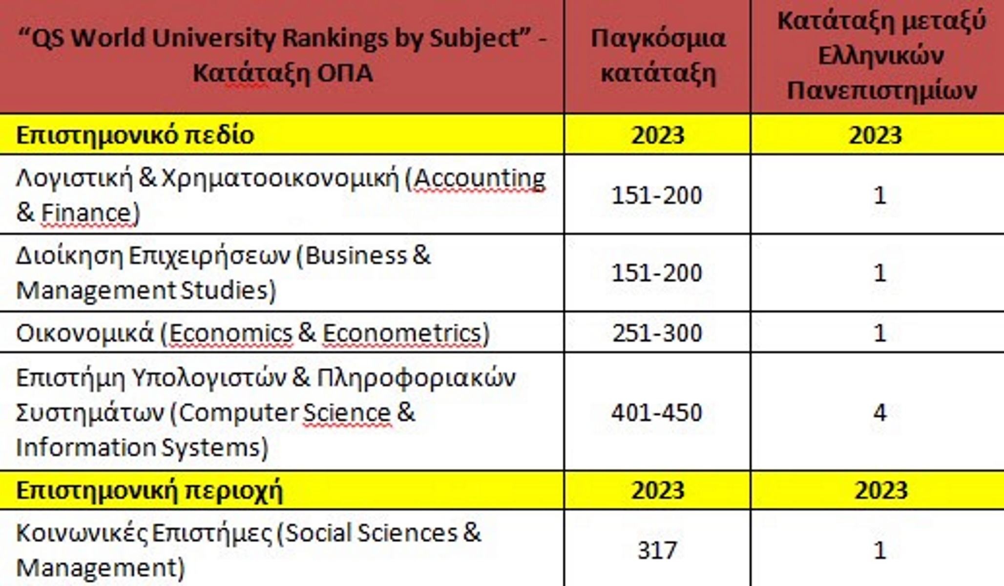 Συγκεκριμένα, το Οικονομικό Πανεπιστήμιο Αθηνών (ΟΠΑ) για το έτος 2023 είναι μεταξύ των κορυφαίων Πανεπιστημίων στον κόσμο στα βασικά επιστημονικά πεδία που αυτό ειδικεύεται. Στην Ελλάδα αναδεικνύεται πρώτο Πανεπιστημιακό Ίδρυμα στα 4 από τα 5 επιστημονικά πεδία στα οποία αξιολογήθηκε.