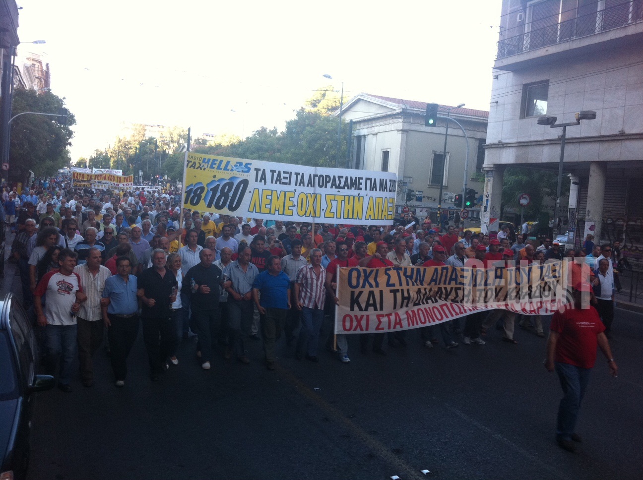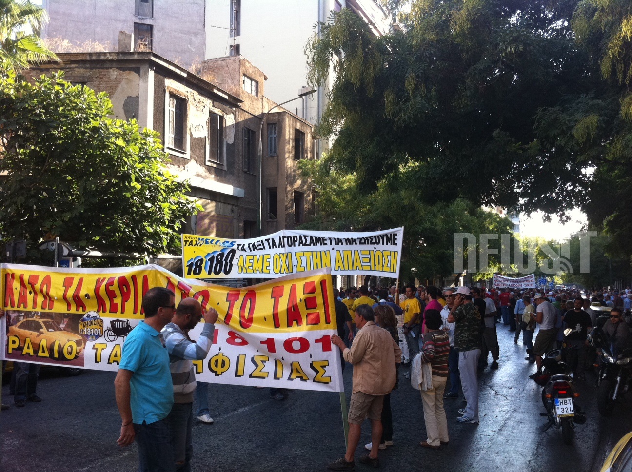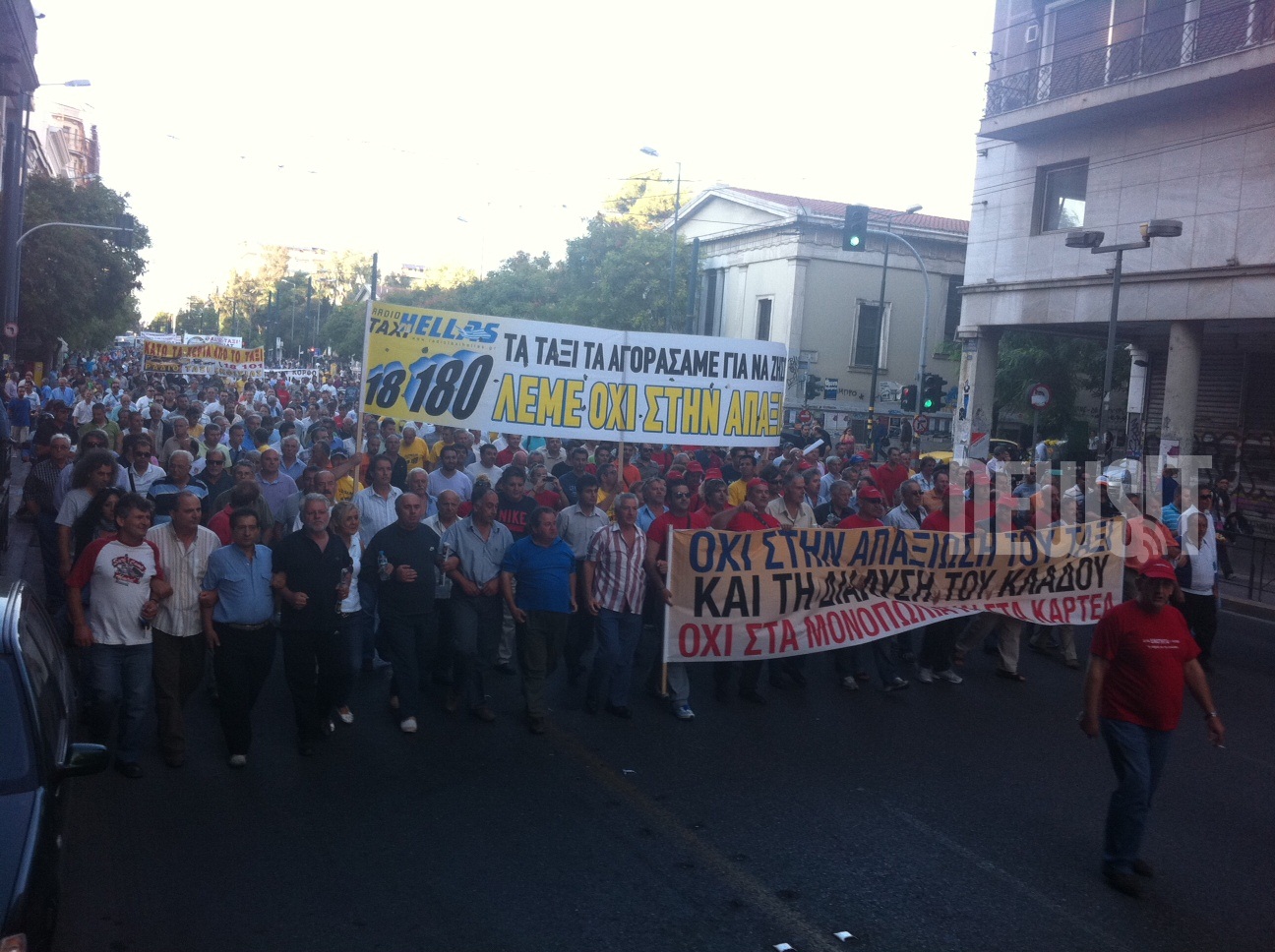 Αντιδρώντας στην απελευθέρωση του επαγγέλματός τους οι ταξιτζήδες συνεχίζουν για δεύτερη μέρα την 24ωρη απεργία και πραγματοποιούν πορεία στο κέντρο.