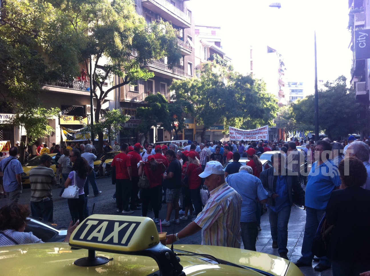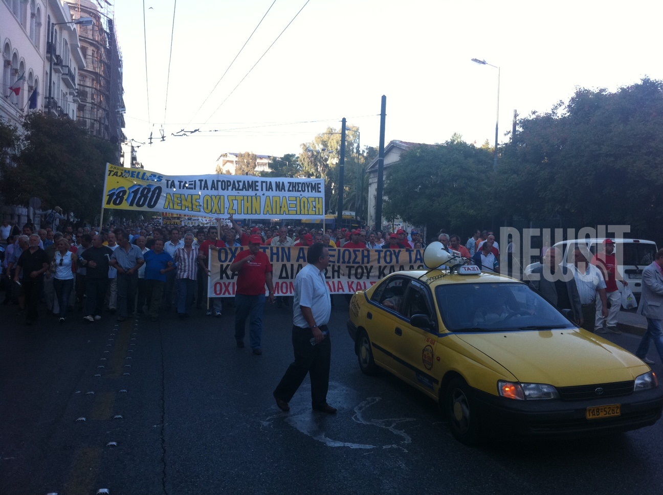 Οι ιδιοκτήτες ταξί και ο πρόεδρός τους Θύμιος Λυμπερόπουλος συγκεντρώθηκαν στις 17:00 στα γραφεία του ΣΑΤΑ και από εκεί ξεκίνησαν πορεία προς το υπουργείο Οικονομικών και τη Βουλή.