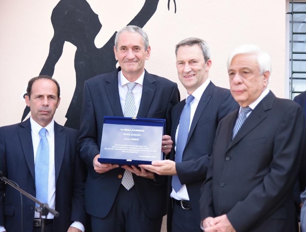 Από αριστερά στα δεξιά: Δήμαρχος Ραφήνας Πικερμίου, Ευάγγελος Μπουρνούς – Εκτελεστικός Πρόεδρος ΟΠΑΠ Καμίλ Ζίγκλερ – Διευθύνων Σύμβουλος ΟΠΑΠ, Ντάμιαν Κόουπ – Πρόεδρος της Ελληνικής Δημοκρατίας, Προκόπιος Παυλόπουλος