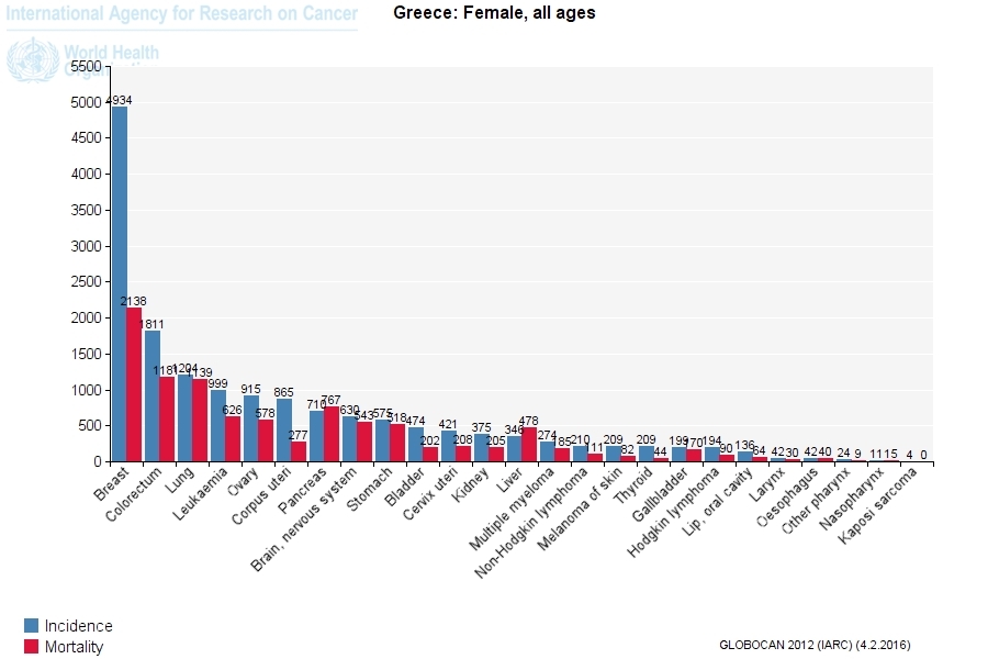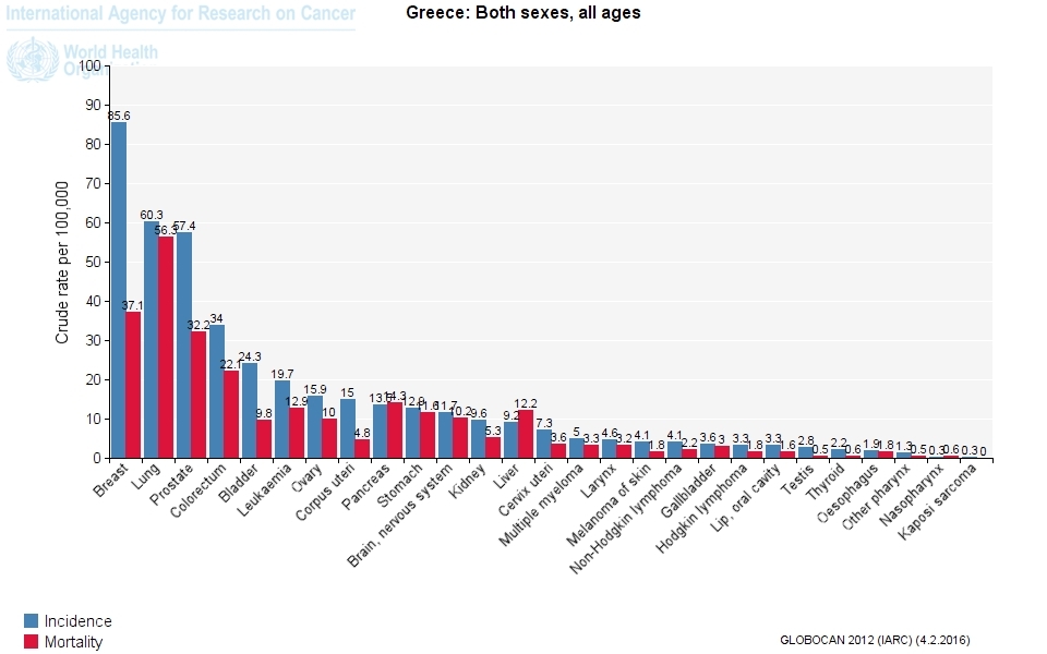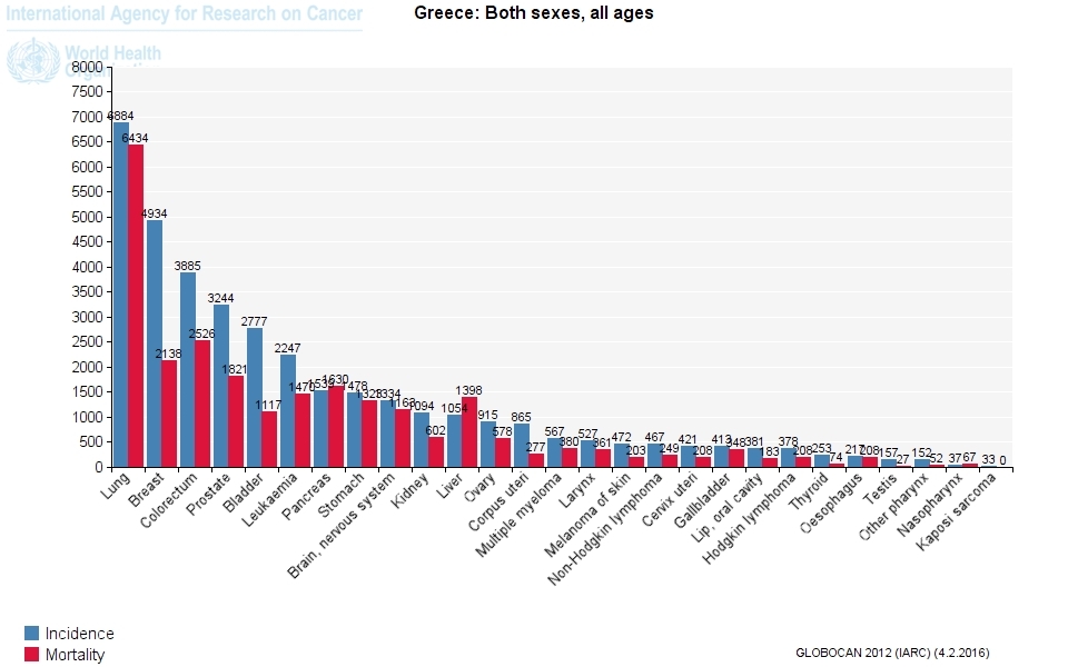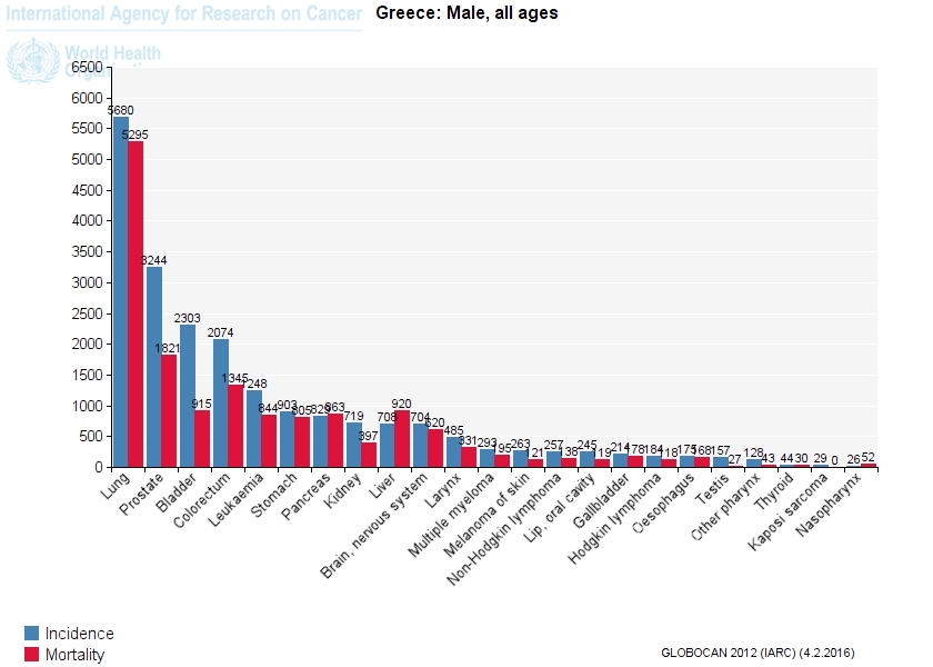 Όπως βλέπετε, ο πιο συχνός καρκίνος στην Ελλάδα είναι ο καρκίνος του πνεύμονα (6.884 νέα κρούσματα και 6.434 θάνατοι το 2012) και ακολουθούν ο καρκίνος του μαστού, ο καρκίνος του παχέος εντέρου, ο καρκίνος του προστάτη και ο καρκίνος της ουροδόχου κύστης.