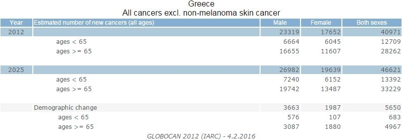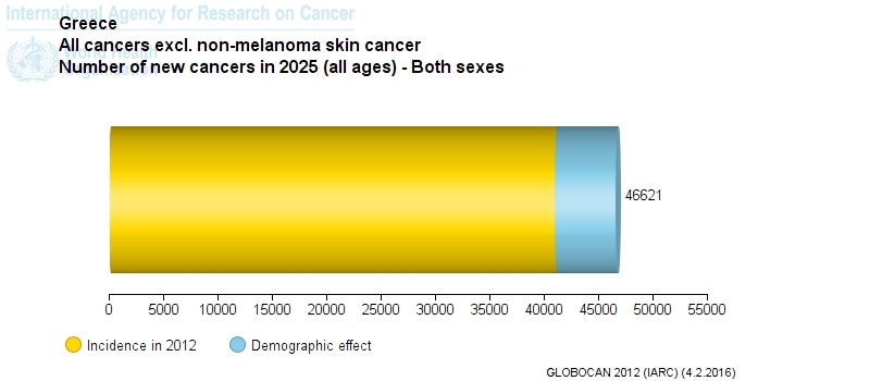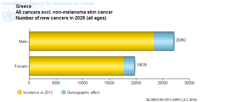 Στα παρακάτω γραφήματα και πίνακες, μπορείτε να δείτε την πρόβλεψη για τα κρούσματα καρκίνου στην χώρα μας μέσα στα επόμενα 10 χρόνια. Με κίτρινο χρώμα βλέπετε το επίπεδο που ήταν τα στοιχεία το 2012 και με γαλάζιο χρώμα την πρόβλεψη/αύξηση για το 2025.