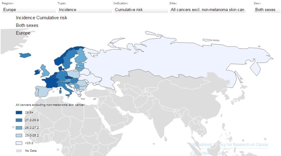 Τέλος, στο τελευταίο γράφημα μπορείτε να δείτε τον κίνδυνο για νέους καρκίνους στην Ευρώπη, και για τα δύο φύλα. Όσο πιο έντονα μπλε είναι η απόχρωση, τόσο μεγαλύτερος είναι ο κίνδυνος. Όπως βλέπετε η Ελλάδα είναι στο χαμηλότερο επίπεδο, κάτι που είναι αρκετά ενθαρρυντικό.